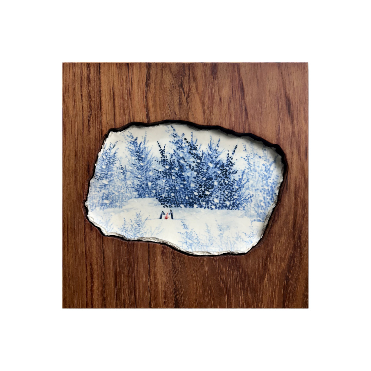 구체가 자리한 자연 풍경이고 나무와 숲이 있는, 그리고 대지와 점경의 인물이 있고 바람이 불고 눈이 내리며 서늘하고 차갑기도 한 계절과 기후의 변화도 감지되는 그런 풍경이다. 구체적인 실경을 소재로 한 것은 아니고 작가에 의해 설정된 가상의 공간이고 연출된 자연이다. 자잘한 붓질과 흩어지는 먹들이 바람에 흩날리는 나무의 상황성을 예민하게 지시한다. ‘후두둑’ 소리를 내며 스치는 나뭇잎들과 가늘고 섬세한 줄기들이 도열 해 하늘을 향해 직립하고 있는 군집의 형태를 매력적으로 그려내고 있다. 촘촘한 미점과 농담의 변화를 동반한 붓질에 의해 생성적인 나무의 존재가 저 자연 속에서 바람에 부대끼고 있다는 상황성이 영상적인 흐름처럼 펼쳐진다. 이는 한지를 부분적으로 뜯어 내서 만든 눈(눈)의 효과와 맞물리면서 계절 감각, 그리고 평면의 화면을 활성적인 존재로 바꿔내는 기법의 도움 속에서 증폭된다. 합장지를 사용해 일정한 두께를 지닌 바탕을 만든 후 그 바닥에 그림이 그려지기도 하고 동시에 한지라는 물성, 물질 자체가 스스로 부조적인 차원으로 일으켜 세워진다. 조심스레 종이의 바닥을 뜯어내면서 눈과 같은 효과를 만드는 일은 조각적인 행위이자 모종의 상실, 아픔을 도드라지게 촉각화 하는 일이다. 그림 속에서 이루어지는 이 가상의 눈이 내리는 장면은 지나온 흔적을 죄다 덮어버리는 상황의 은유이기도 하고 기억을 지워나가는 행위 내지 잊혀져가는 시간을 회상하는 이미지화에 해당한다. 특히 설경을 그린 그림에서는 이른바 블러링 효과에 유사한 기법에 의해 흐릿하고 모호한 장면을 안겨준다. 이것 역시 시간과 기억을 다루는 작가의 주제에 의한 방법론으로 보인다.