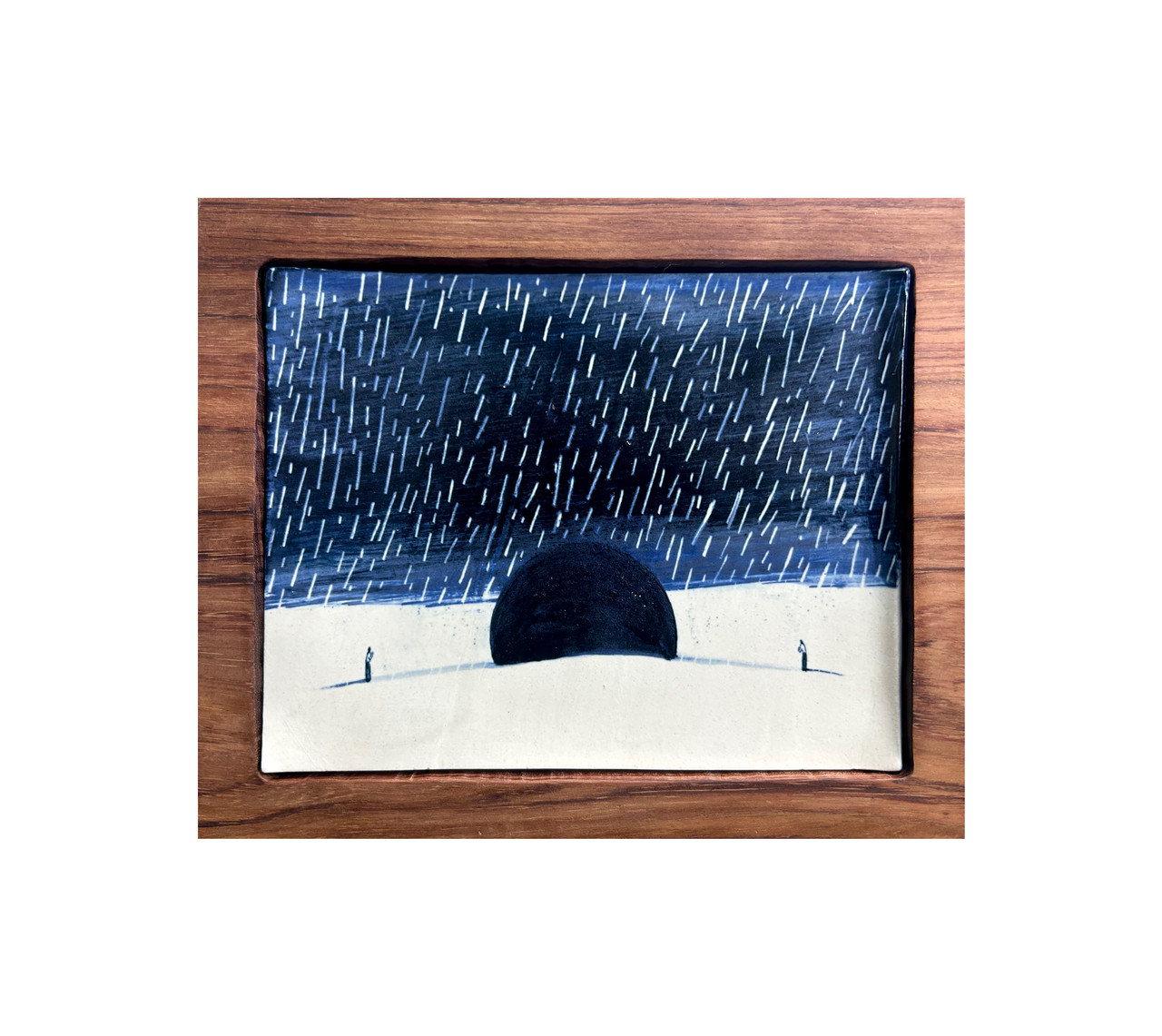대부분 전경과 후경으로 나뉘어진 화면 가운데 공간에 여백을, 공터를 두어 모종의 사건이, 서사가 발생하는 핵심적인 지점을 마련하고 있다. 그곳에는 작은, 아주 작게 그려진 인물이 하나, 둘 정도 그려졌다. 전통적인 인물산수화에서 접하는 점경인물에 해당하는 이 작은 인간은 진한 검정색으로 마감된 평면적인 원형의 덩어리를 서로 다른 방향에서 마주 보고 서 있거나 구체의 주위를 배회하는 등의 여러 상황을 그려 보인다. 눈이 내리는 겨울 풍경이 주를 이루는데 이때는 구체 옆에서 모닥불을 피우고 모여있거나 원형의 덩어리를 눈을 뭉쳐 밀고 가기도 한다. 왜소한 인간 존재들이 자연/세계 안에서 실존적인 생의 어느 몸짓을 부려놓거나 시간의 흐름 안에서 겪는 여러 상실의 감정을 누수 하는 장면 연출이다. 이런 서사는 소박하고 익숙한 감성적 코드를 건드리는 편이다. 친절한 산문성을 지닌 이야기 구조에서 벗어난 그림에서 이 작가의 힘이 돋보인다. <지나오면서 필연적으로>와 같은 그림이 그런 사례인데, 거대한 자연, 타자로서의 자연과 대면하고 있는 구체를 설정해놓은 이 그림은 나무와 풀, 그 혼돈스러운 미지의 존재를 대면하는 왜소한 인간의 자리를 효과적으로 연출하고 있다. 그런 정신이 전통적인 인물산수화 안에 도사리고 있음을 암시하고 지시하는 그림이라는 생각이다. 그리고 여기에서 인물산수화의 현대적인 변용이, 전통에 대한 동시대 작가의 해석과 반응이 모형화되는 한 추이를 흥미롭게 만나게 된다.