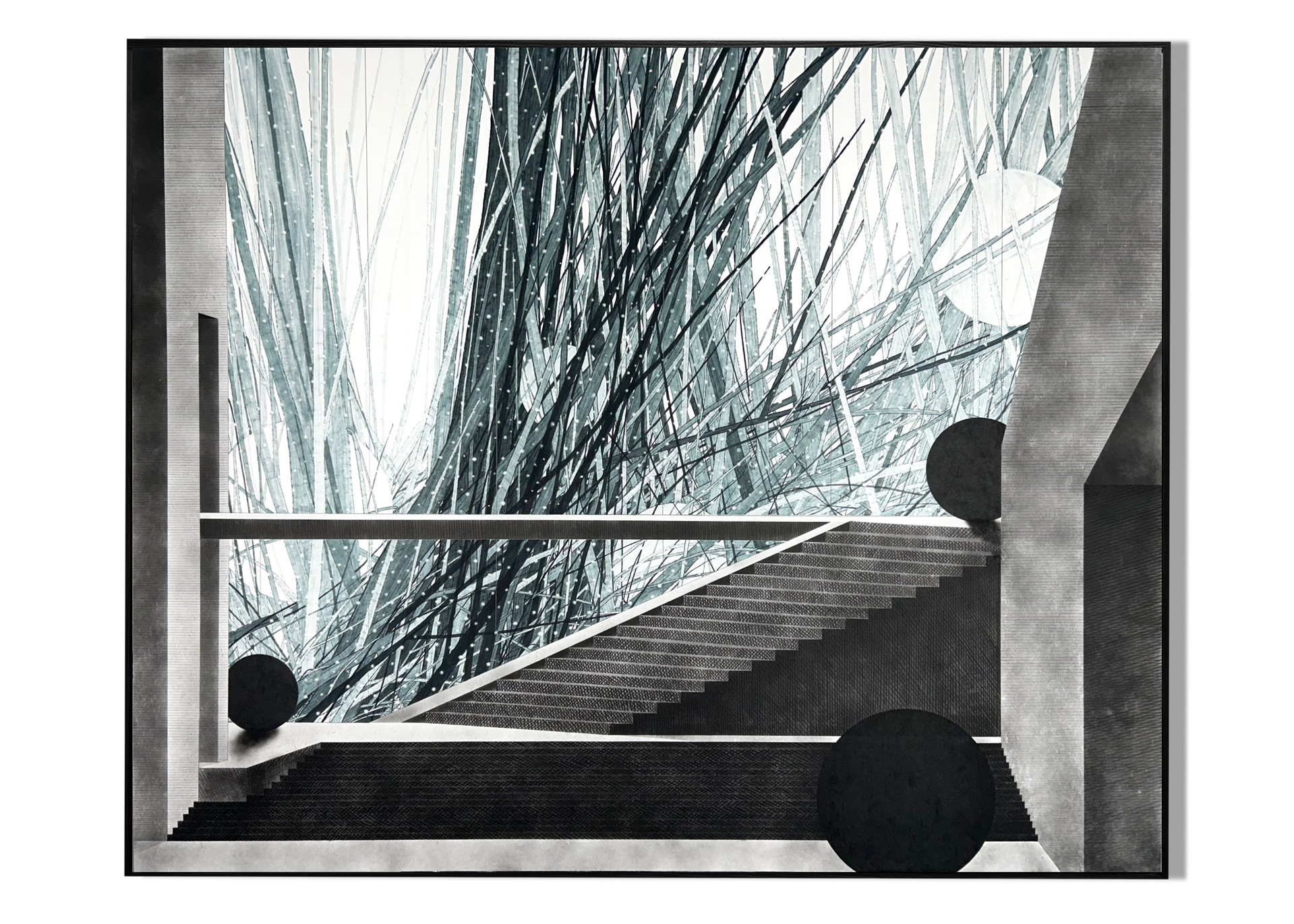 이는 화면의 양 모서리를 막아 세운 건물의 벽, 그리고 중앙에 펼쳐진 계단으로 인해 증폭된다.