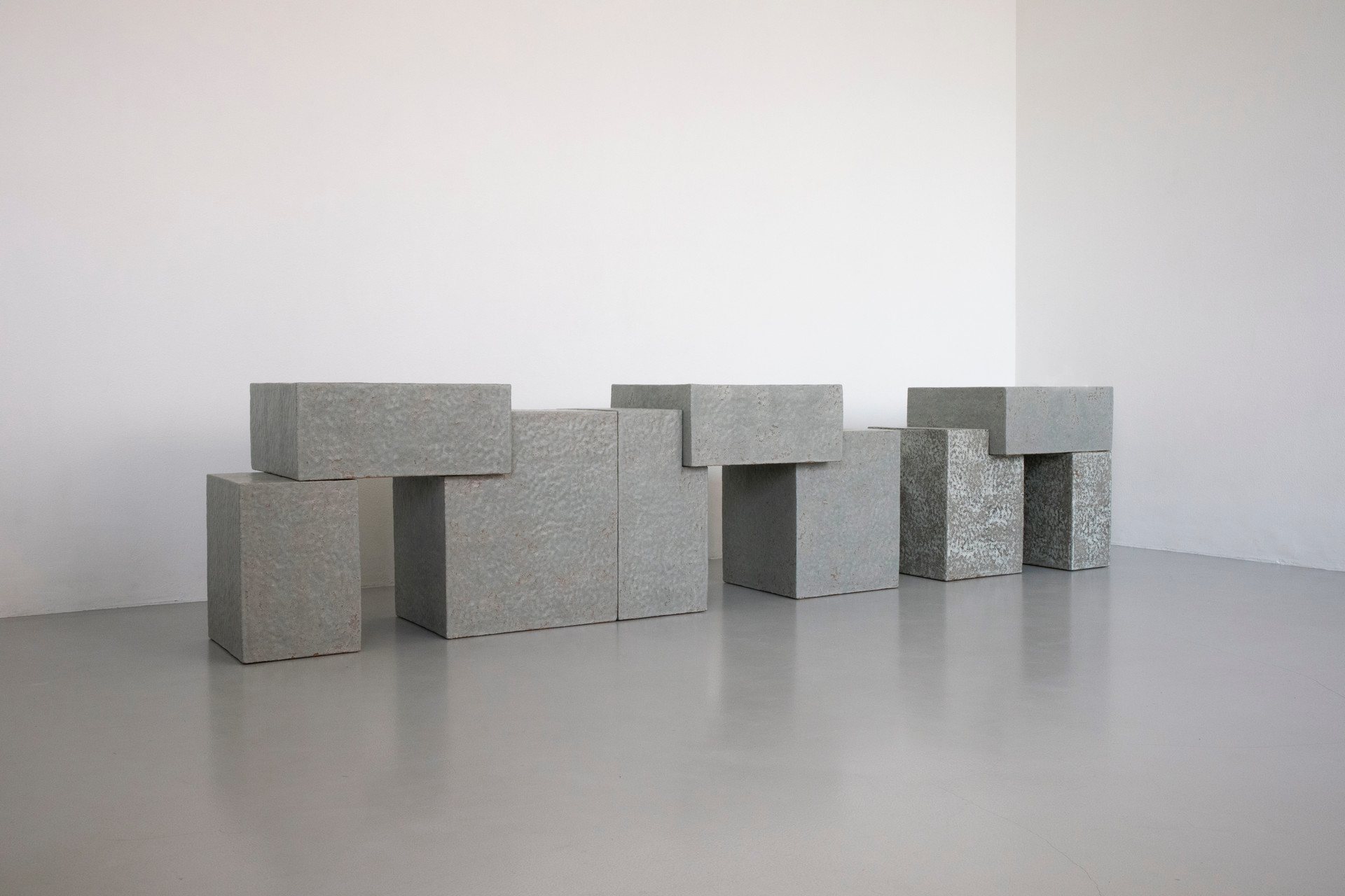 건축적 양감을 도자 오브제로 치환하여 작업을 할 때, 건축의 입면이나 디테일, 기능들을 모 두 없애고 오직 비례만이 남도록 한다. 이는 양적으로 무언가를 만드는 것도 중요하지만, 반 대로 무언가를 비워내는 작업도 필요하다고 생각했기 때문이다. 단순화 작업을 통해 나의 팔 레트에는 오직 비례와 색, 질감따위 밖에 남지 않았지만, 오히려 제한된 요소들 안에서 미묘 한 변화들이 더욱 주목받기를 의도한 것이다. 코일링 기법을 통해 만들어진 손자국들은 계산 된 손의 움직임으로 우연적인 질감을 만들어 단순한 형태의 공백을 채워주는 장치로서 작용 한다. 이는 흙을 한층 한층 쌓으며 생기는 계산된 우연성들이 만들어낸 완결을 목표로 한다."